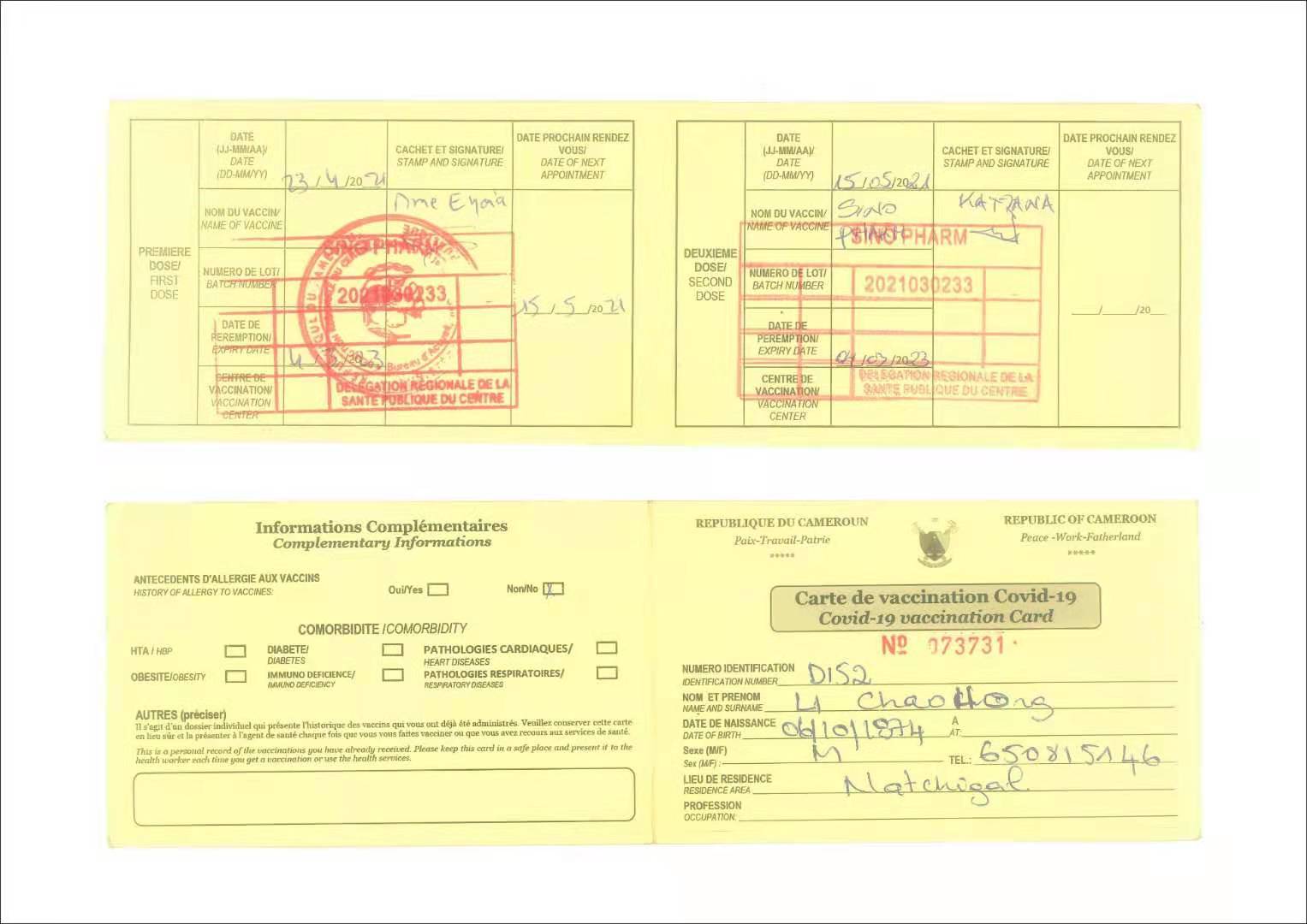 咸陽證件翻譯蓋章 成績單翻譯 戶口薄翻譯 駕照翻譯 喀麥隆新冠疫苗接種卡翻譯模版